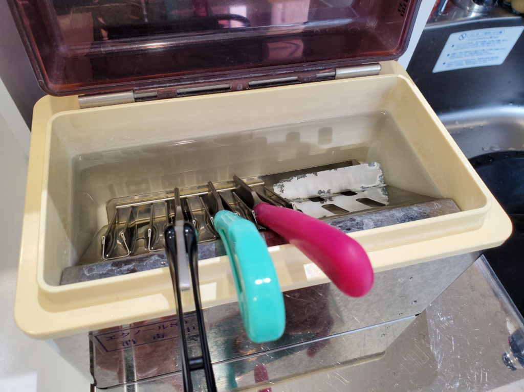 - 理容椅子、刈布、ハサミ、剃刀など器具の消毒